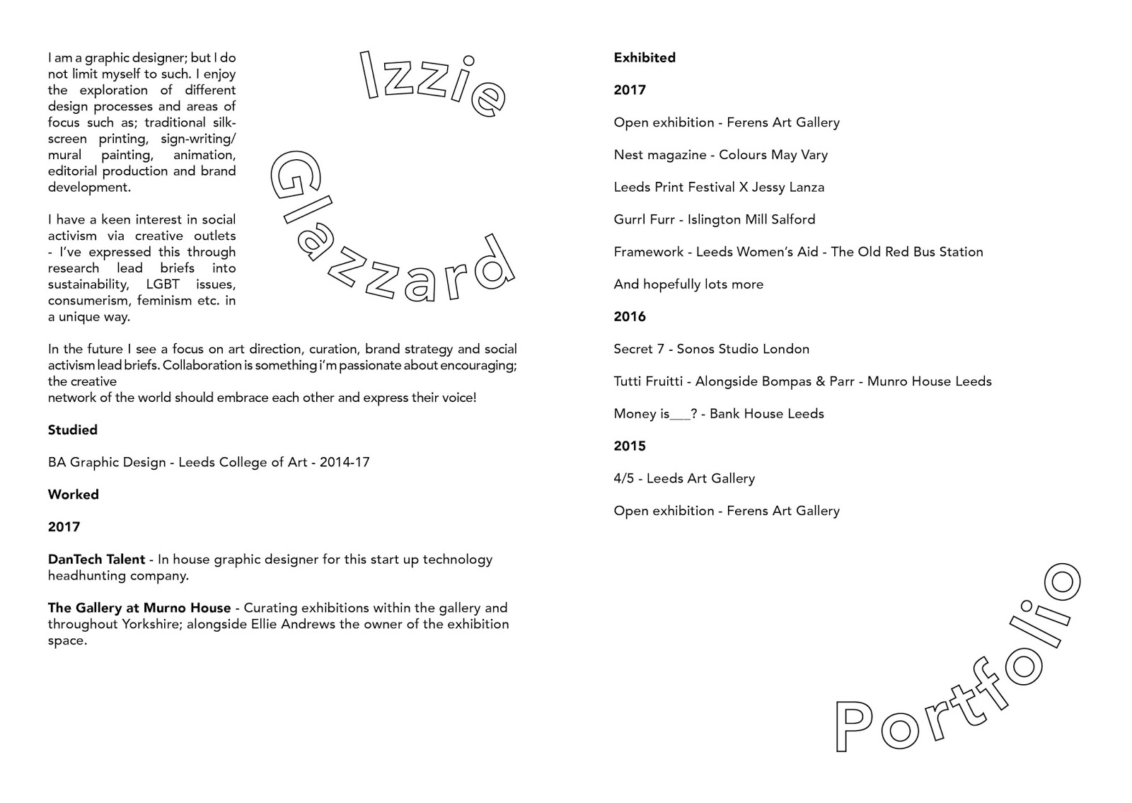 For future job applications and interviews I will be printing and potentially binding this - I created an Issuu version to show what this will look like - https://issuu.com/izzieglazzarddesign/docs/portfolio_for_issuuu - I have also embedded this into my website under the links panel incase potential employers are looking - https://izzieglazzard.com/links/